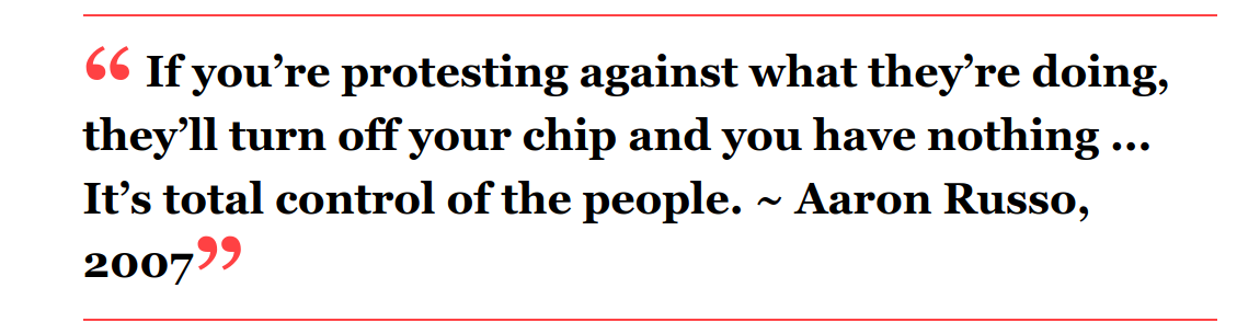 “There will be no more cash, and this [information] was given to me straight from Rockefeller himself,” Russo said. “So, they can take out any money they want, any time they want. They say, ‘You owe us this much in taxes,’ and they just take it out of your chip. Total control. And ... if you’re protesting against what they’re doing, they’ll turn off your chip and you have nothing ... It’s total control of the people.”