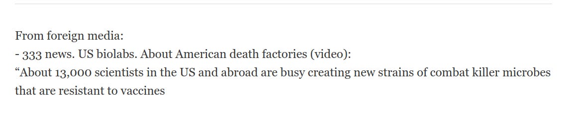 Wow, this is a wealth of information, thanks! Fast forward to the 4:59 minute mark to hear our own U.S. government (Under Secretary of State for Political Affairs Victoria Nuland) admit to these biolabs yesterday in Senate testimony: https://rumble.com/vwy3fj-episode-1694-you-are-a-combatant-in-americas-economic-war-against-the-russi.html
