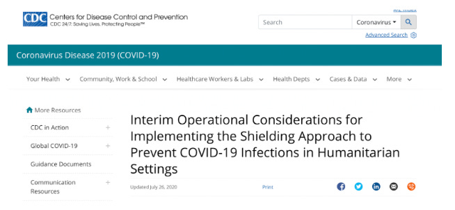 “This document presents considerations from the perspective of the U.S. Centers for Disease Control & Prevention (CDC) for implementing the shielding approach in humanitarian settings as outlined in guidance documents focused on camps, displaced populations and low-resource settings. This approach has never been documented and has raised questions and concerns among humanitarian partners who support response activities in these settings. The purpose of this document is to highlight potential implementation challenges of the shielding approach from CDC’s perspective and guide thinking around implementation in the absence of empirical data. Considerations are based on current evidence known about the transmission and severity of coronavirus disease 2019 (COVID-19) and may need to be revised as more information becomes available.”