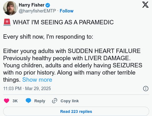 Harry Fisher, a seasoned paramedic, shared a deeply unsettling post on X , revealing his front-line observations of a massive surge in health emergencies that he believes are linked to the mRNA “vaccine” rollout.