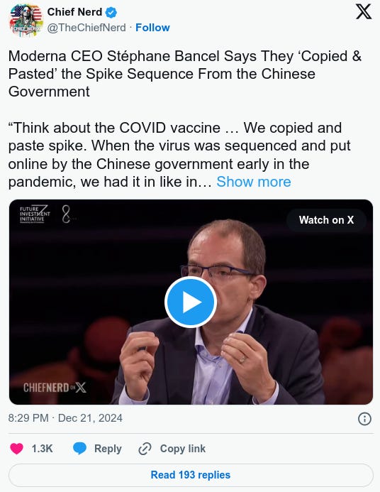 Moderna CEO Stéphane Bancel Says They ‘Copied & Pasted’ the Spike Sequence From the Chinese Government
