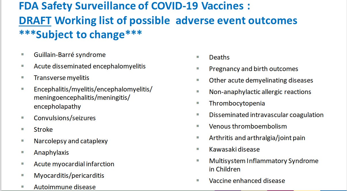 FDA Safety Surveillance of COVID-19 Vaccines: DRAFT Working list of possible adverse event outcomes This document was published in October 2020 BEFORE the jab roll-out began.