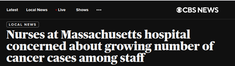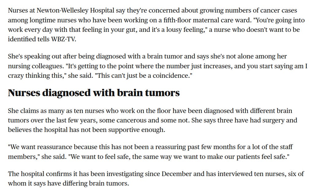 Nurses at a Massachusetts hospital are terrified after 10 of their colleagues were diagnosed with brain tumors, primarily from the same maternity ward.