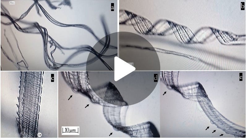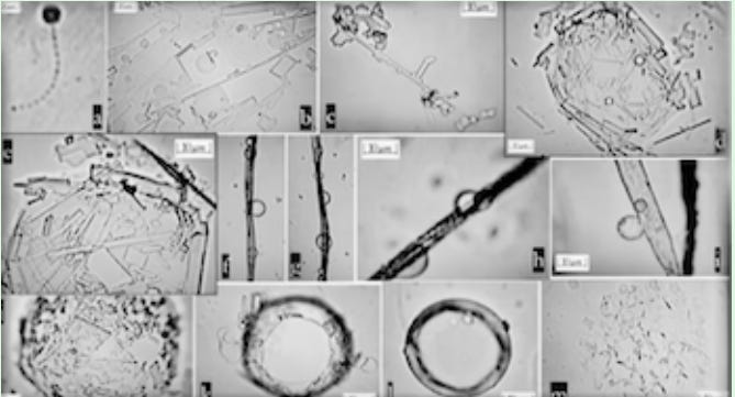 “…There were animated worm-like entities, discs, chains, spirals, tubes, right-angle structures containing other artificial entities within them, and so forth. All these are exceedingly beyond any expected and acceptable level of contamination of the COVID-19 injectables,and incubation studies revealed the progressive self-assembly of many artifactual structures. As time progressed during incubation, simple one-and two-dimensional structures over two or three weeks became more complex in shape and size developing into stereoscopically visible entities in three-dimensions. They resembled carbon nanotube filaments, ribbons, and tapes, some appearing as transparent,thin, flat membranes, and others as three-dimensionalspirals, and beaded chains. Some of these seemed to appear and then disappear over time.Our observations suggest the presence of some kind of nanotechnology in the COVID-19 injectables.”