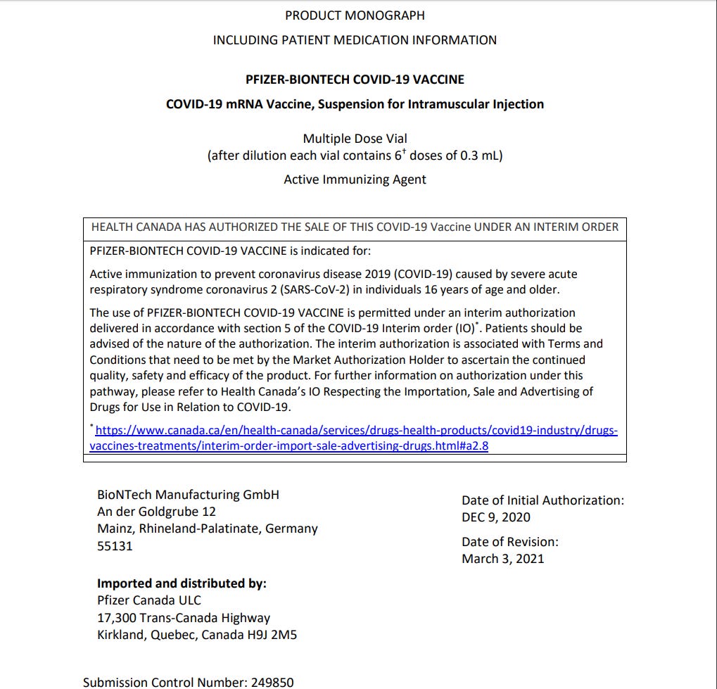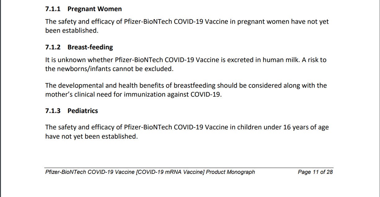 Pfizer Product Monograph: The Safety and Efficacy of Pfizer COVID-19 Vaccine in Pregnant Women and Children Under 16 Years of Age Have Not Yet Been Established