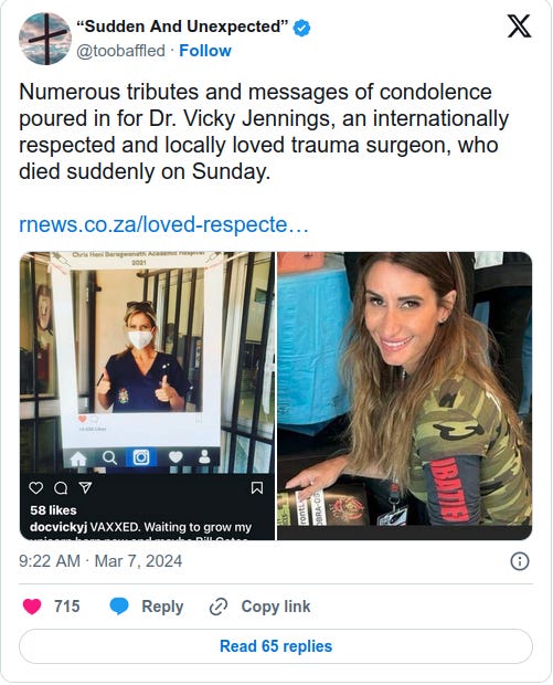 Jennings’ death was announced by Netcare, the healthcare company that she worked for.