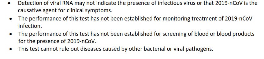 CDC 2019-Novel Coronavirus (2019-nCoV) Real-Time RT-PCR Diagnostic Panel Page 38: "Detection of viral RNA may not indicate the presence of infectious virus or that 2019-nCoV is the causative agent for clinical symptoms; This test cannot rule out diseases caused by other bacterial or viral pathogens.”