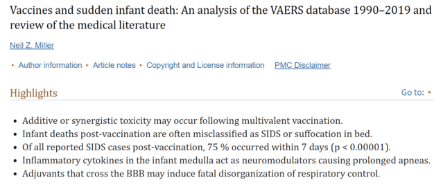 [1] Neil Z. Miller. Vaccines and sudden infant death: An analysis of the VAERS database 1990–2019 and review of the medical literature. Toxicol Rep. 2021; 8: 1324–1335.