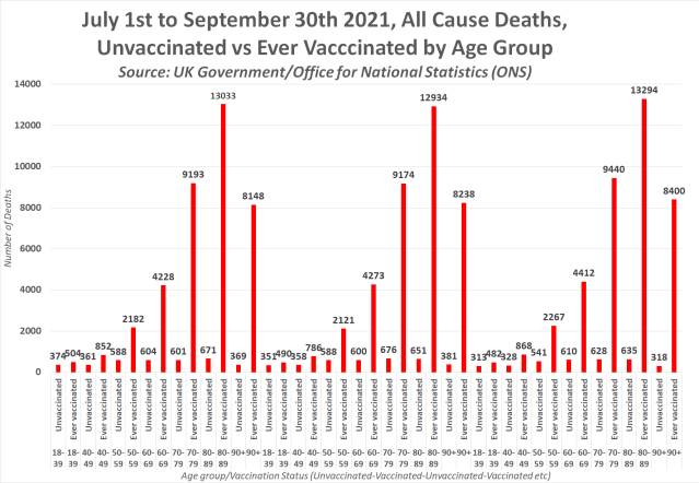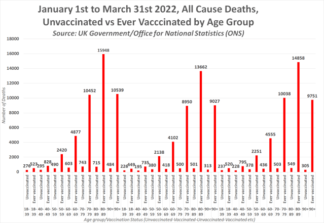 The unvaccinated deaths are shown first in each age group and the vaccinated deaths are shown next in each age group.