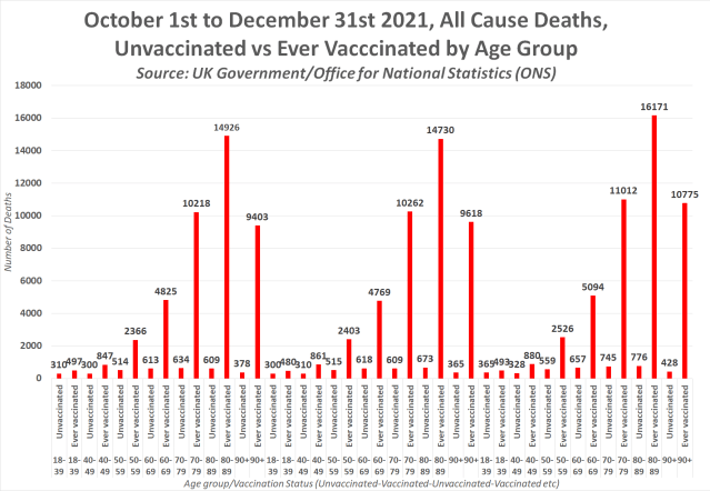 In contrast, the highest number of vaccinated all-cause deaths occurred among the 80 to 89-year-olds in December 2021 with a shocking 16,171 deaths.