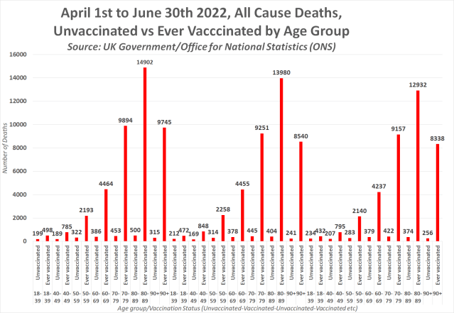 At the same time, the highest number of vaccinated all-cause deaths occurred among the 80 to 89-year-olds in April 2022 with a shocking 14,902 deaths.