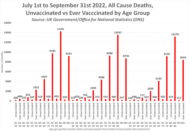 In comparison, the highest number of vaccinated all-cause deaths occurred among the 80 to 89-year-olds in January 2022 with a shocking 15,948 deaths.