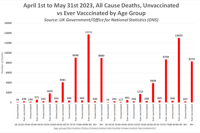 At the same time, the highest number of vaccinated all-cause deaths occurred among 80 to 89-year-olds in April 2023 with a shocking 13,713 deaths.