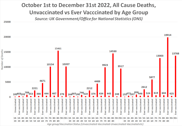In contrast, the highest number of vaccinated all-cause deaths occurred among the 80 to 89-year-olds in December 2022 with a shocking 19,914 deaths.