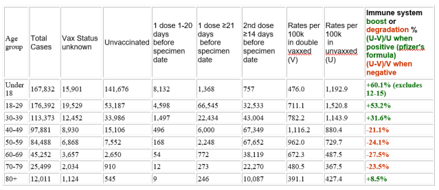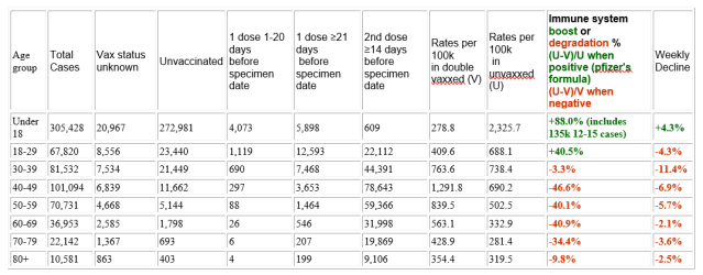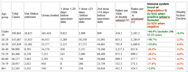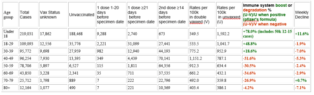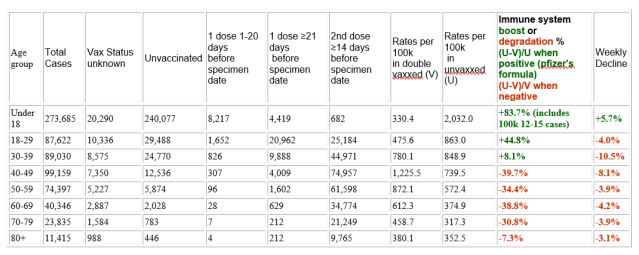 The 5 PHE tables below from their excellent Vaccine Surveillance Report, separated by 4 weeks, clearly show the progressive damage that the vaccines are doing to the immune system’s response.