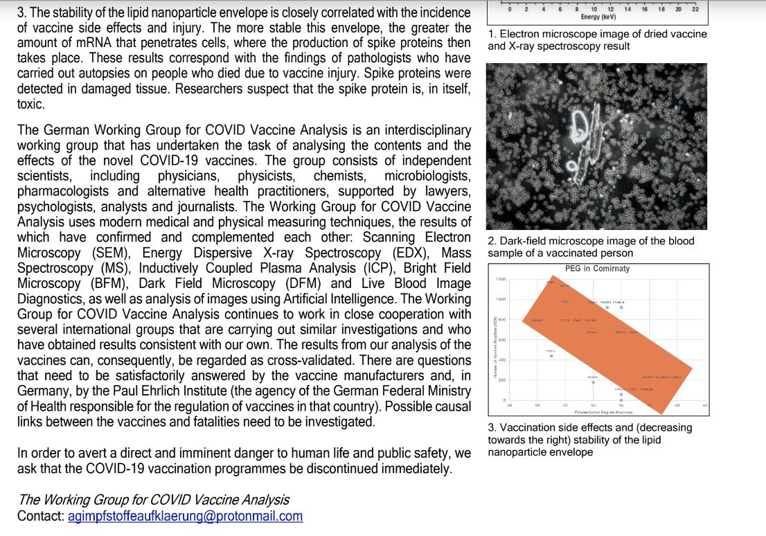 This shocking report from German scientists shows and describes objects found in Covid19 “vaccines” as well as those injected. They also find detectable amounts of antimony in the Moderna agent. It is not known what these objects are. At the very least it shows recklessness in filling vaccine vials & absent QC/QA. - Dr. Michael Yeadon