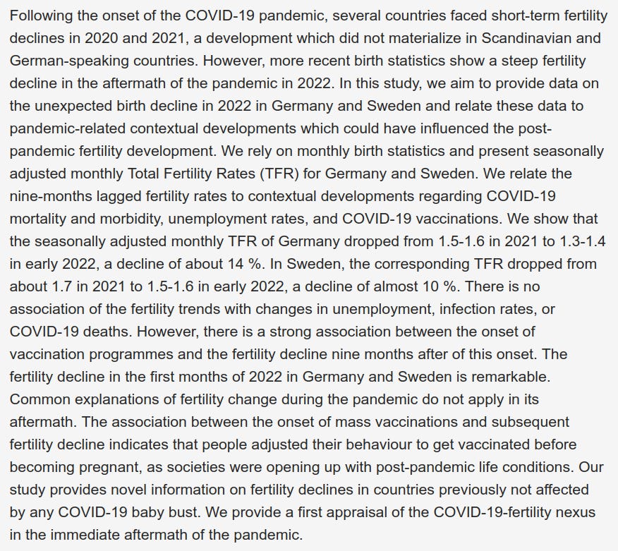 “ We show that the seasonally adjusted monthly TFR of Germany dropped from 1.5-1.6 in 2021 to 1.3-1.4 in early 2022, a decline of about 14 %. In Sweden, the corresponding TFR dropped from about 1.7 in 2021 to 1.5-1.6 in early 2022, a decline of almost 10 %. There is no association of the fertility trends with changes in unemployment, infection rates, or COVID-19 deaths. However, there is a strong association between the onset of vaccination programmes and the fertility decline nine months after of this onset.”
