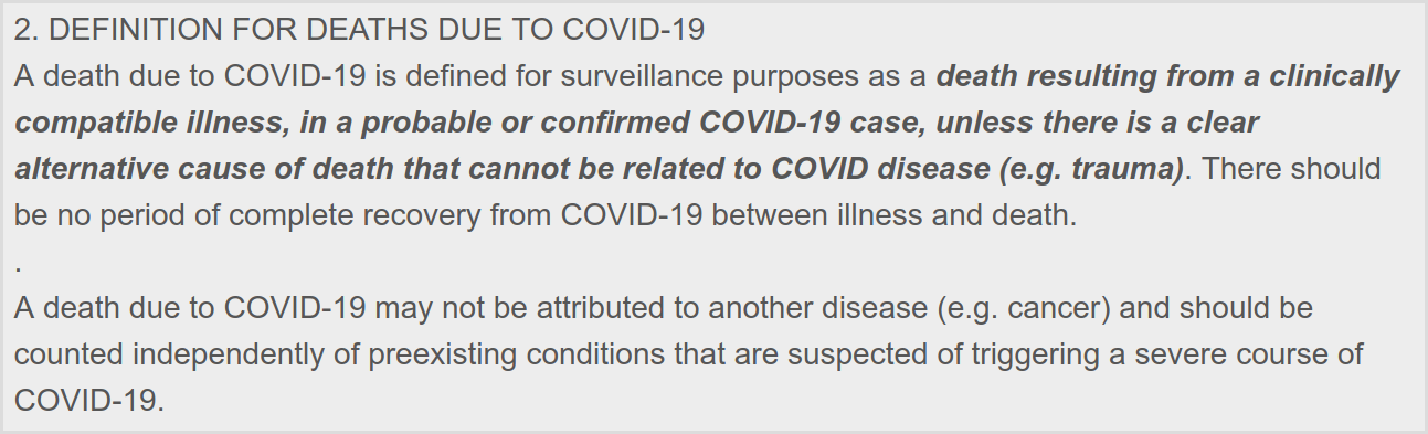 Admittedly, it wasn’t really a topic addressed here for quite a while. However, the time has long come for hitting this home. And what is the definition of a “Covid death”? According to the World Health Organization, it is: