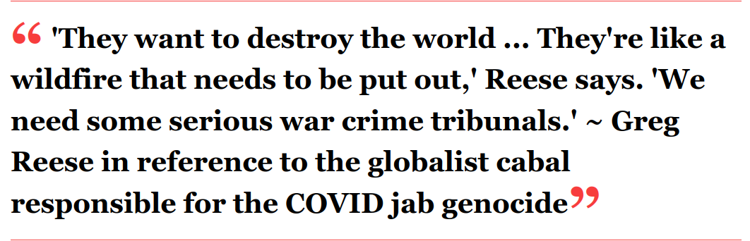 In the short video above, Greg Reese, who created "The COVID Genocide" documentary, shares his reasons for making it. "They want to destroy the world," he says, referring to the globalist cabal that are the planners, if not actual orchestrators, of this medical genocide.