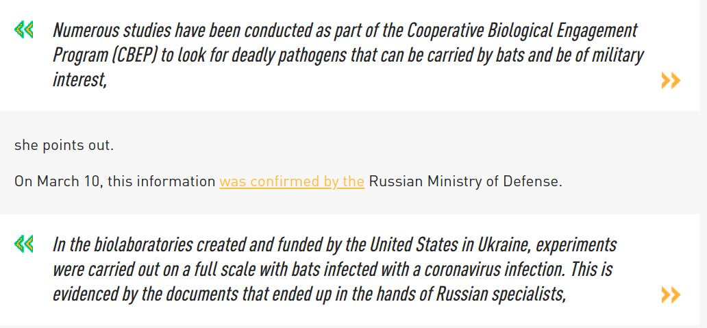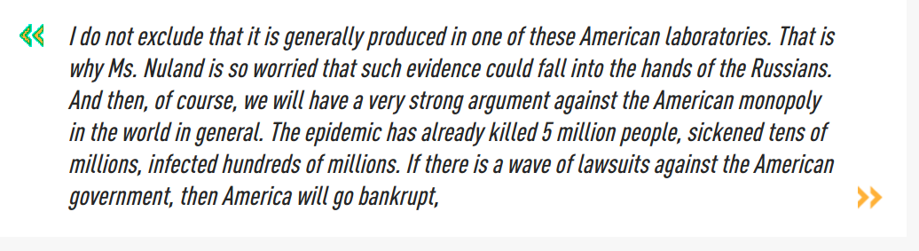 But we do not see peaceful developments. We see examples of toxin leaks in Ukraine. We see tens and hundreds of millions of dollars and euros allocated for these facilities by the Pentagon, and not by any other US ministry. Everything indicates that developments in Ukraine are of a military nature. Numerous researchers, journalists, experts, and even leaked US Department of Defense documents agree with us.