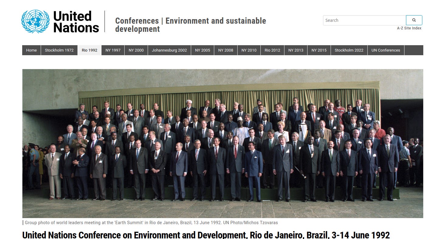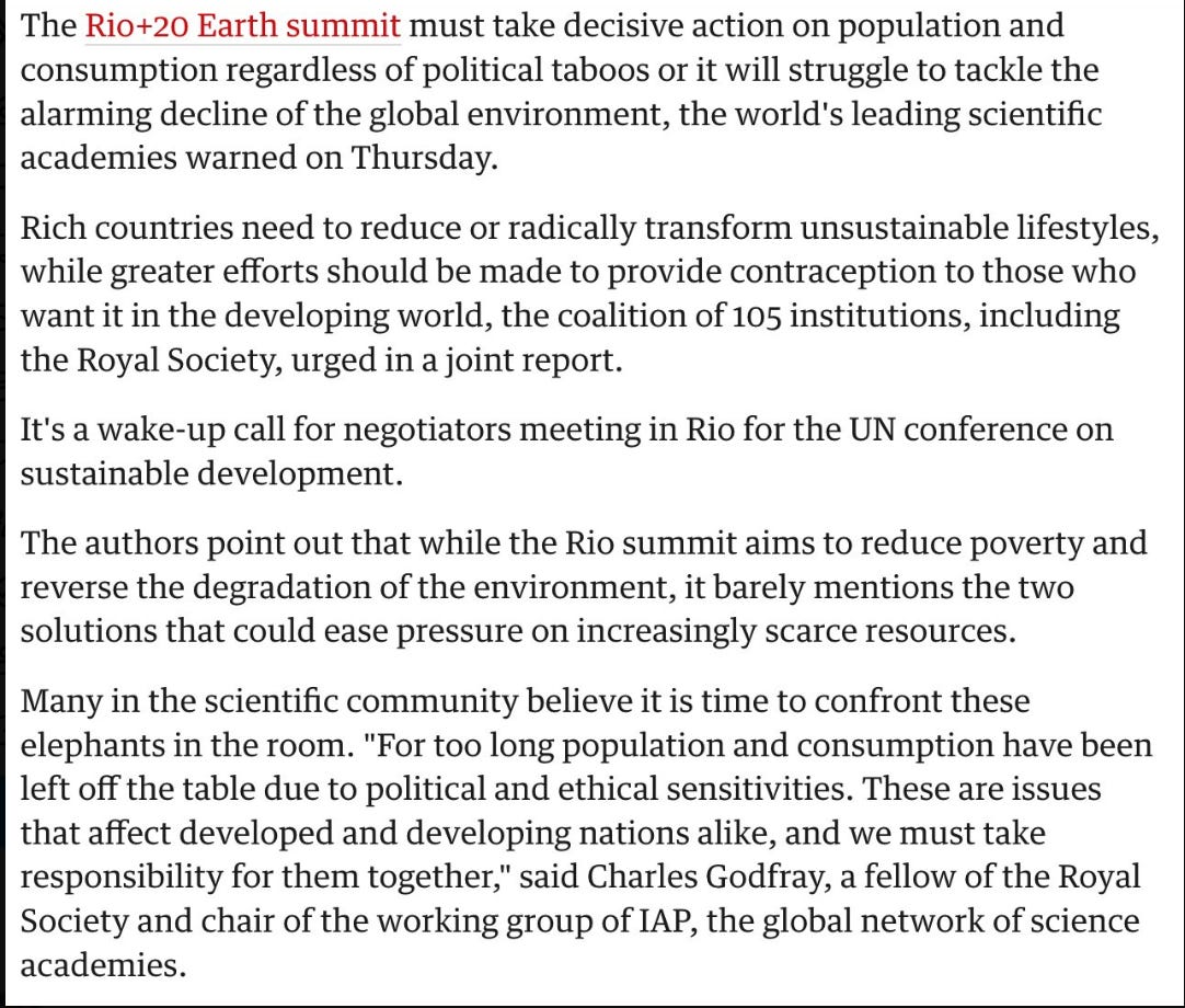 The United Nations Conference on Environment & Development (UNCED), aka Rio Conference/ Earth Summit: 'Rio+20 Earth summit: scientists call for action on population' (2011): Joint report by 105 institutions urges negotiators to drop political inhibitions and confront rising global population and consumption "The P-word is not talked about because people are scared of being politically incorrect or alarmist.