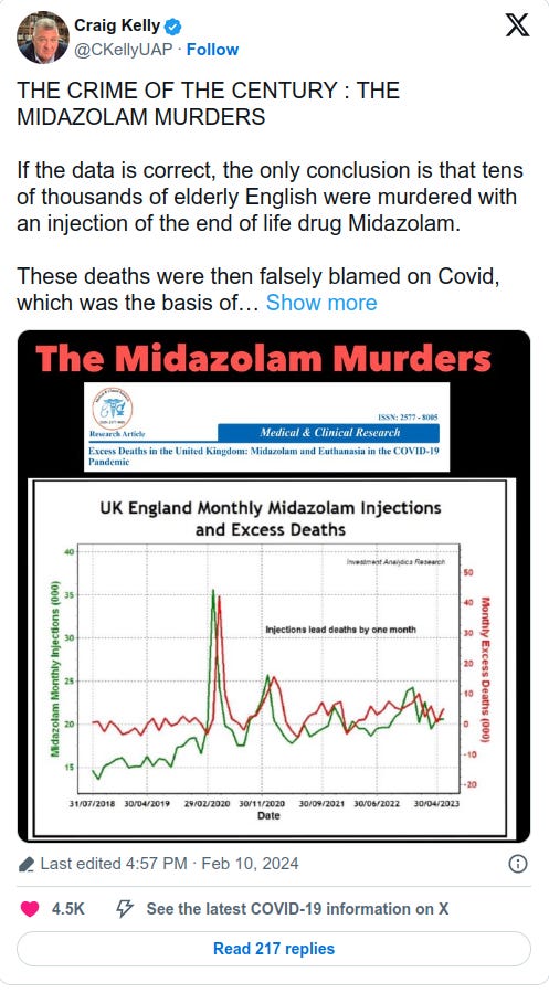 “Importantly, excess deaths remained elevated following mass vaccination in 2021, but were statistically uncorrelated to COVID injections, while remaining significantly correlated to Midazolam injections.”