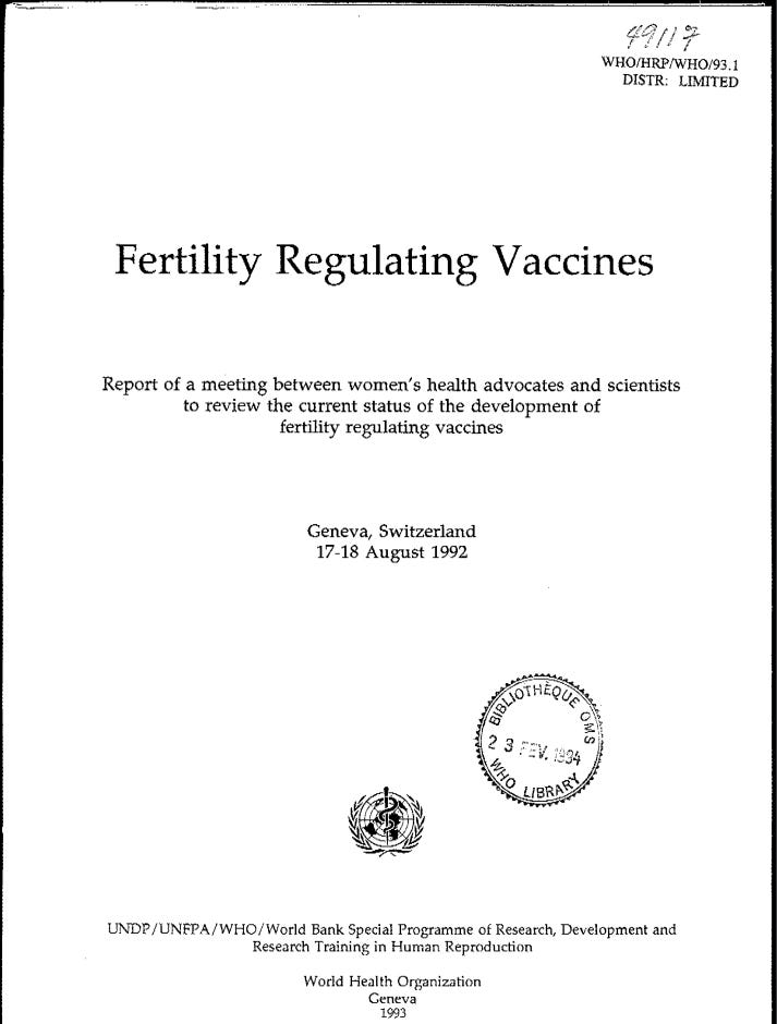 Fertility regulating vaccines : report of a meeting between women's health advocates and scientists to review the current status of the development of fertility regulating vaccines, Geneva, 17-18 August 1992