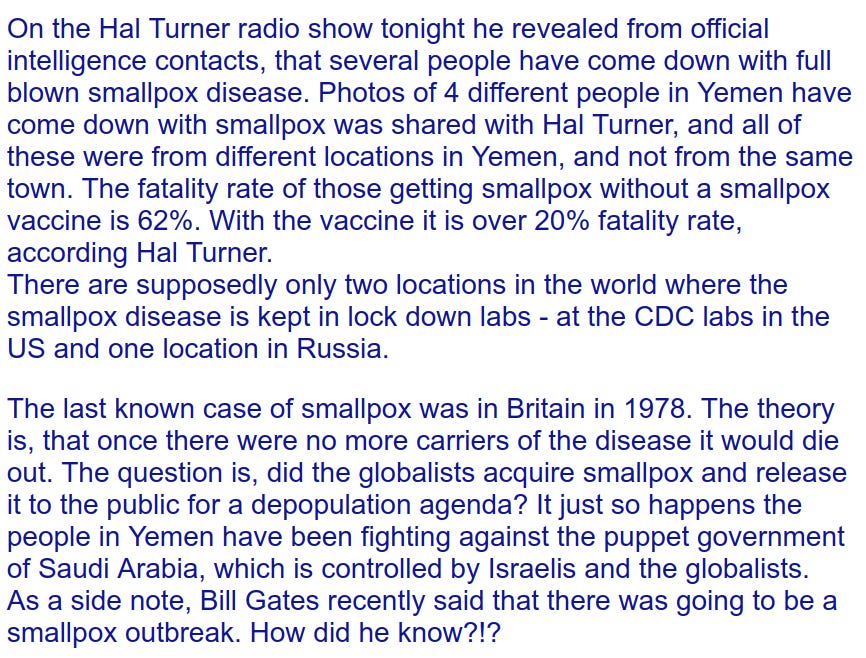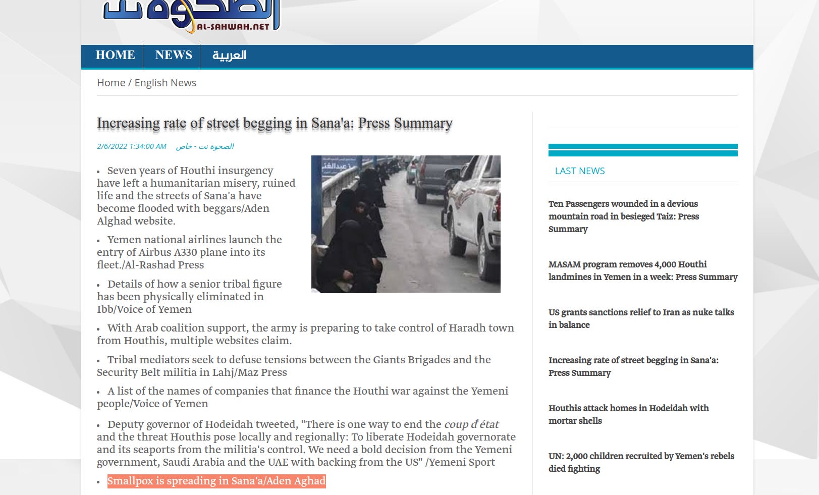 The information Hal Terner received from the intelligence sources seems to be legit. According to Yemeni News Resource Alsahwa-Yemen.net/English News from 2/6/2022, Smallpox is spreading in Sana'a/Aden Aghad