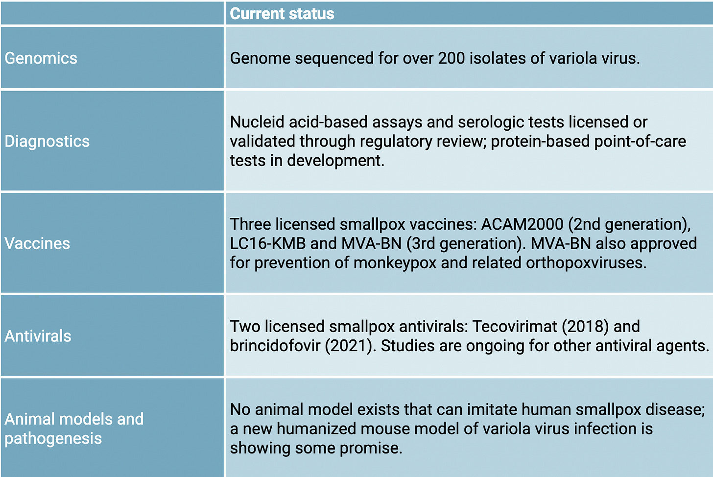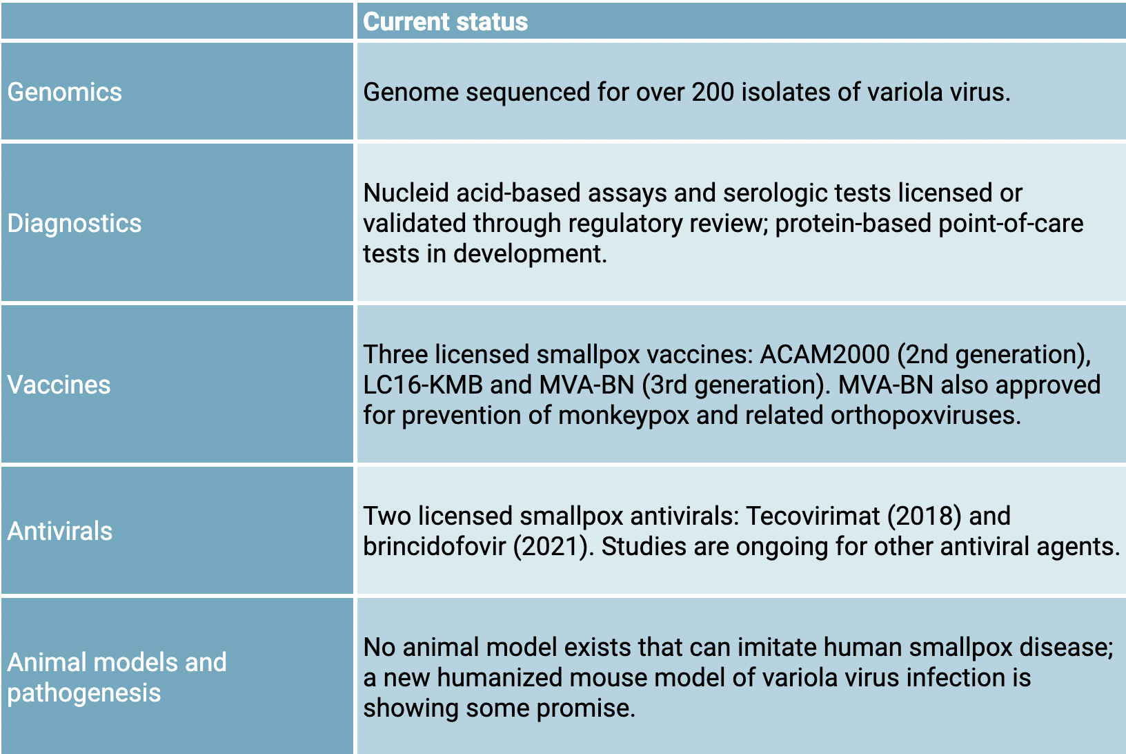 Status of smallpox research and medical countermeasures Table was updated in June 2021