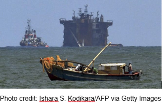 Newsweek reported a ship off the coast of Sri Lanka containing 25 tons of toxic chemicals caused significant damage to the planet.
