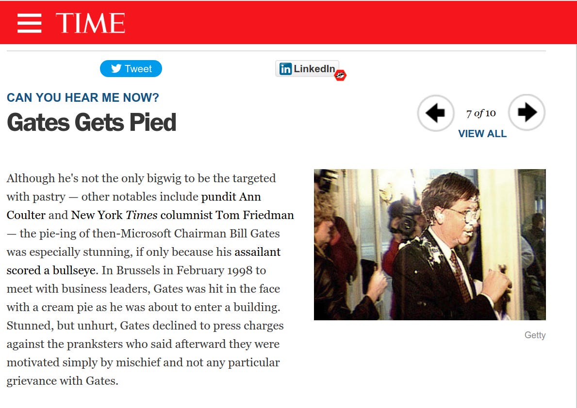 By getting pied Gates was initiated into his role of the Dark Vaccine Wizard of the future Plandemic.