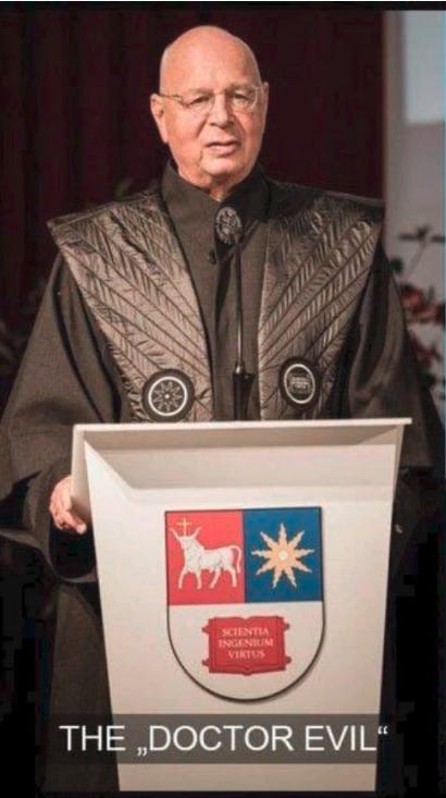 The World Economic Forum is a front organisation. Klaus Schwab is a puppet actor who portrays the character of Doctor Evil
