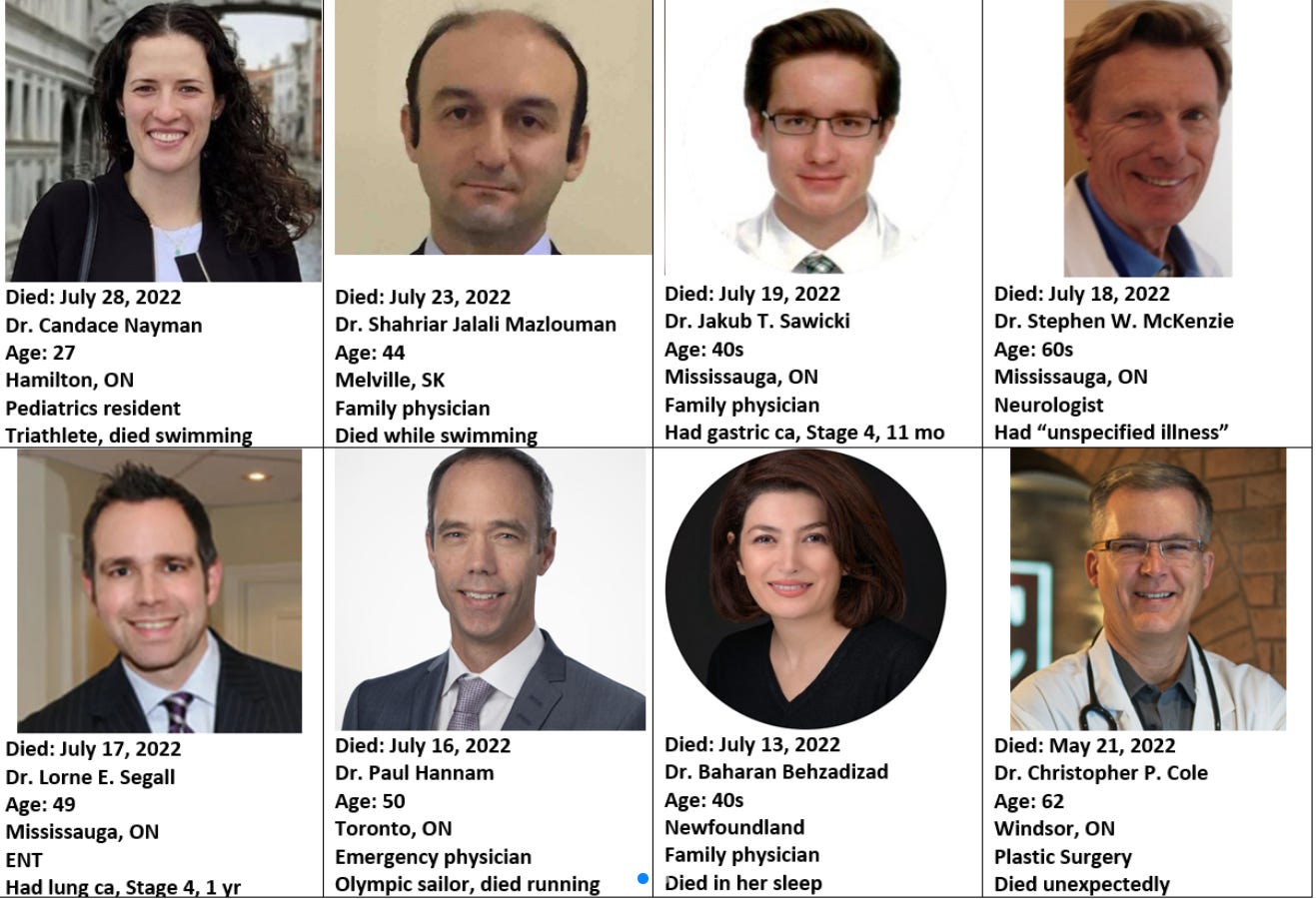 I've now tracked 13 Canadian doctors "sudden deaths" (thank you to everyone who contributed info). This is the most complete data set I've seen anywhere by far.