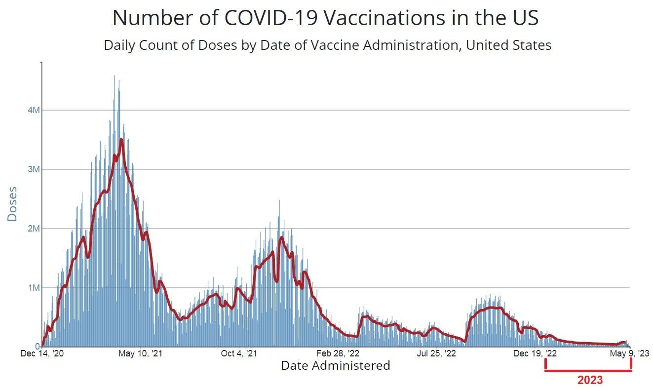 And yet in spite of these lower amounts of COVID-19 injections here in 2023, there have still been 9,776,541 doses distributed through May 9, 2023.