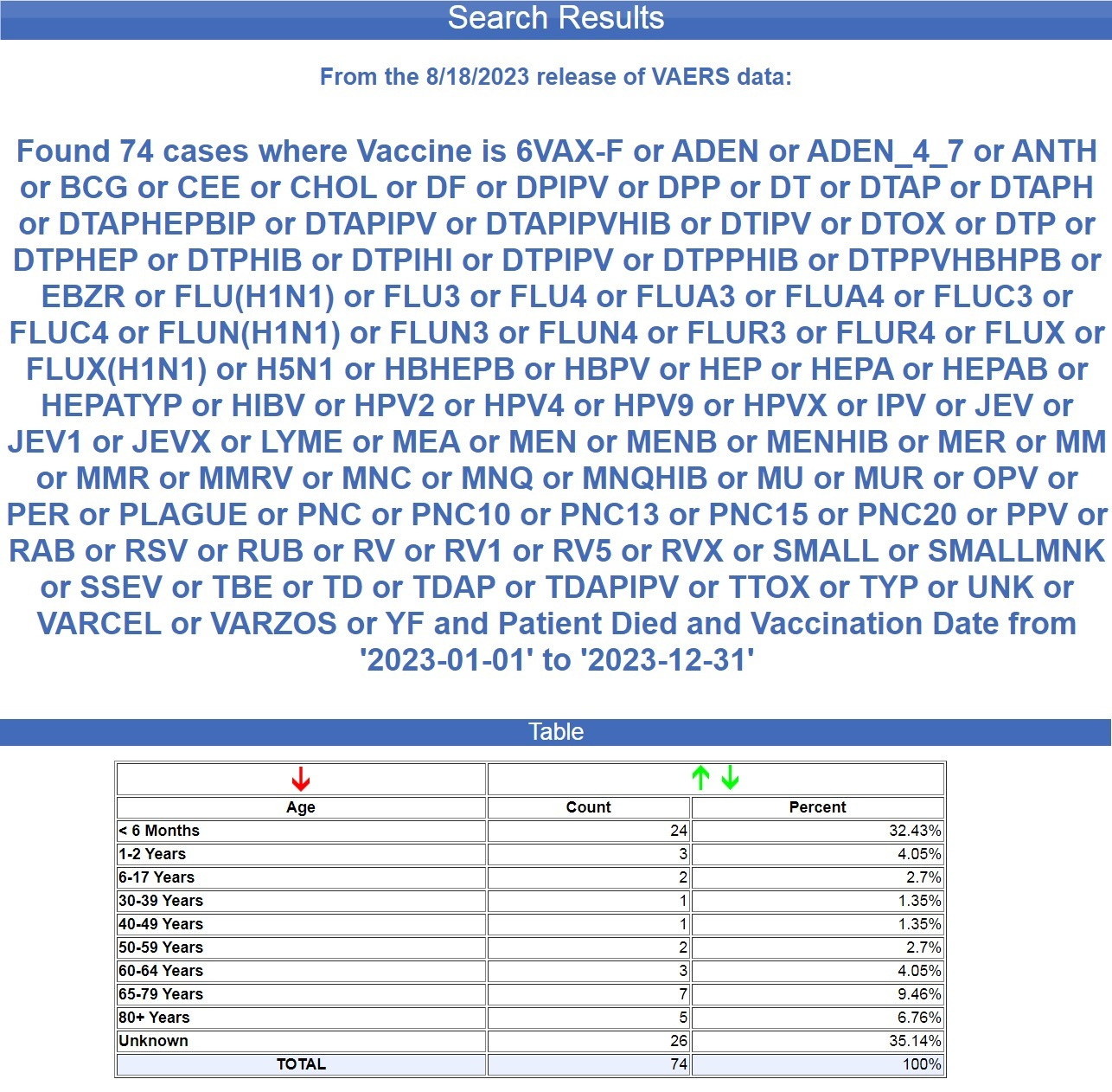 Here is the age breakdown of all the non-COVID vaccines so far here in 2023 that have resulted in deaths. (Source.)