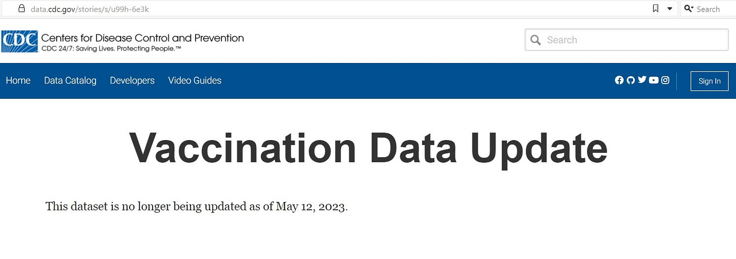 (Note: This will be the LAST article I will be able to write with current information on the number of COVID-19 vaccination doses administered, because as of May 12, 2023, the CDC is no longer updating their data on amount of COVID-19 injections that are being distributed. Source.)