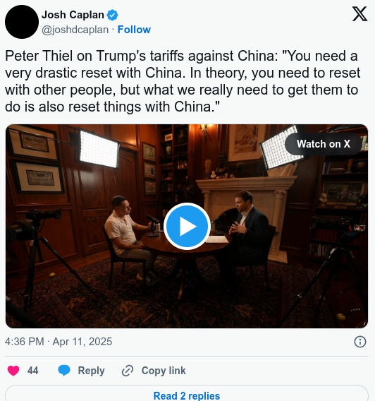 Thiel, one of the infamous “PayPal mafia,” and a major financier of Trump-Vance, recently told American Optimist host Joe Lonsdale that “something like the sort of reset that they’re talking about now seems where we’re going, where you need a very drastic reset with China.”