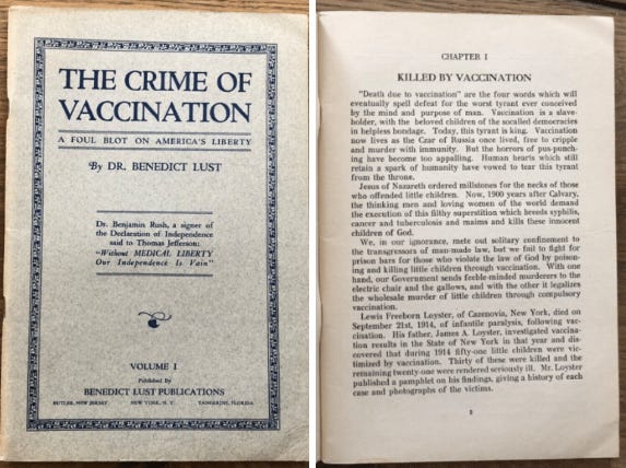 In 1926, Dr. Benedict Lust published his 61-page booklet ‘The Crime of Vaccination: a Foul Plot on America’s Liberty (Volume I)’ through Benedict Lust Publications. In it, he criticised the practice of vaccination and argued that vaccination is a violation of personal liberty and lacks scientific basis.