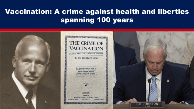 Featured image: Dr. Benedict Lust (left). Source: Wikipedia. Cover of ‘The Crime of Vaccination’ by Dr. Benedict Lust (centre). Senator Ron Johnson (right).