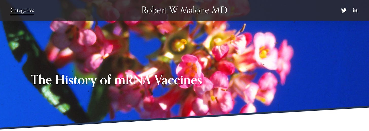 It was about half-way through 2021 when Dr. Malone showed his face in public discourse. Remember the weird thrill that rippled through the battered band of shot-resisters? Look: the mRNA inventor was throwing shade, some, anyway, on the mass injection program at that time in full-throttle- enforcement.Yes, to be sure, Xyklon B isn't for everybody....How exciting? I'm not sure what psychological buttons Malone's arrival on the scene pushed; as I think back on it now, such enthusiasm doesn't make a lot of sense. After all, he didn't come forward expressing remorse, as lots of great inventors have done before him, rueing their sometimes literally earth-shaking inventions, from the atom bomb and the Kalishnakov, to the office cubicle and the labradoodle. Notably, "The History of mRNA Vaccines" still unfolds under a spray of lovely pink blossoms here on Malone's website.