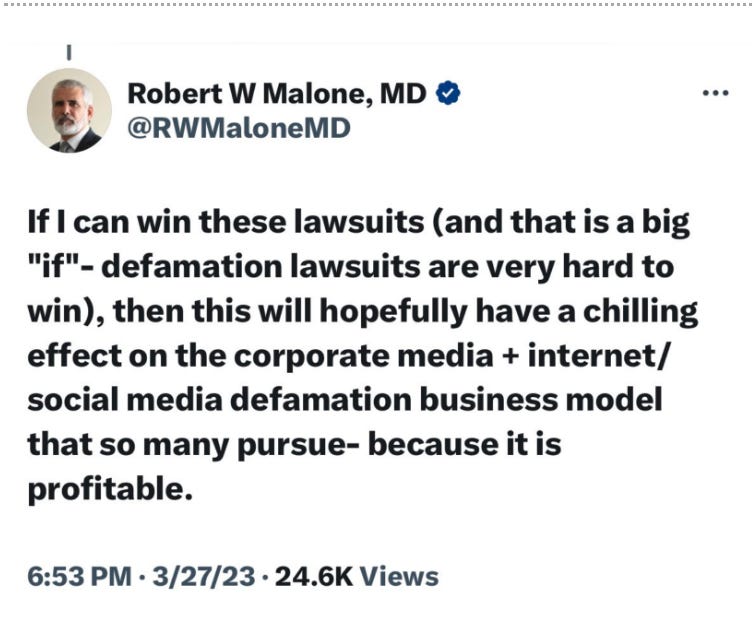 The totalitarian-style censorship and disinformation which government, media and social media imposed upon us were (are) catastrophic and also fatal in all too many cases. That's why when we learn, through arduous court-ordered FOIA research or congressional hearings or secret interviews or confessions ... or autopsies that we were right to doubt and disbelieve and not comply, there are dead bodies, broken homes, ruined lives and a shattered future to embitter our vindication. To intensify our rage. That's why Dr. Robert Malone's openly stated goal in 2023 to use the courts to have a "chilling effect' on debate in the public square, which he's trying to rebrand as "defamation," is so disturbing, bizarre and fraught with peril.