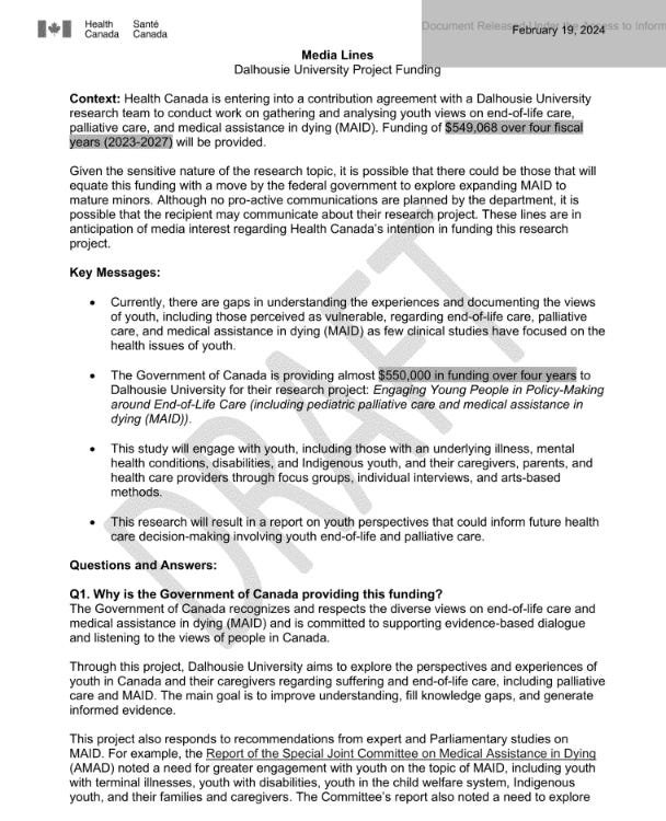 The access to information records, obtained by a third party and given to Rebel News, reveal that Health Canada is funding a $549,068 research project with Dalhousie University to study "youth views on end-of-life care, palliative care, and MAID." That funding spans four years. So while families across the country can't get basic autism services or timely mental health support for their kids, the federal government is bankrolling a four-year focus group to explore what children think about state-sanctioned suicide.