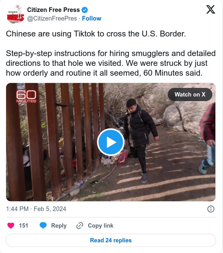 Notice how almost all the Chinese illegals in the above video were men, most of them of military age. The folks at 60 Minutes conveniently forgot to report that part.