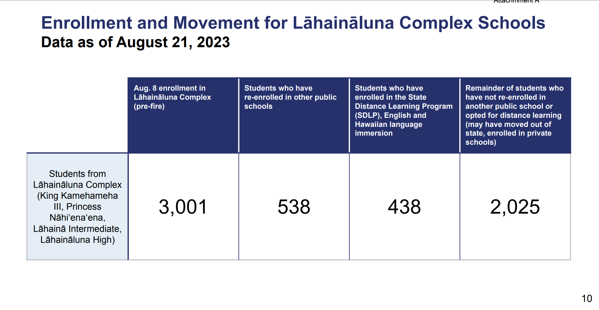 ... the DOE must account for the 2,025 students who had been attending Lahaina’s four public schools before the fires, and who are now unaccounted for. That’s about two-thirds of the Lahaina student body who had not enrolled in other Hawaii public schools or the state’s distance learning program as of last week. State officials have said they don’t yet know how many have left the system for private schools or the mainland, are pausing schooling, or are among those missing after the Lahaina fire.
