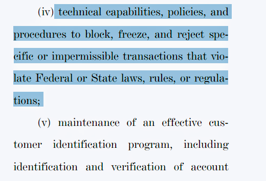 “A permitted payment stablecoin issuer shall be treated as a financial institution [and]…shall be subject to all Federal laws applicable to a financial institution located in the United States including…policies and procedures to block, freeze, and reject specific or impermissible transactions that violate Federal or State