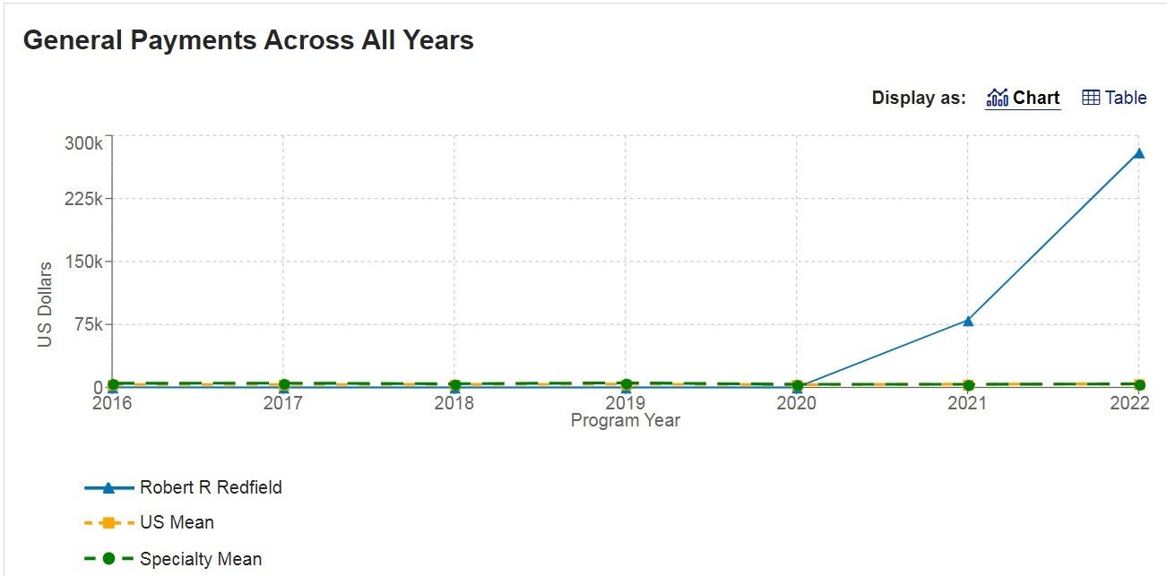 Since Redfield is a medical doctor, the first thing to do is see if openpaymentsdata.cms.gov has any records on him in receiving kickbacks from Big Pharma, and sure enough, they do.