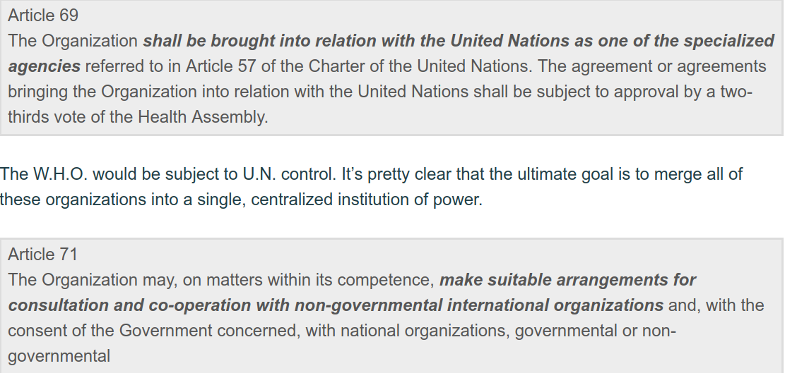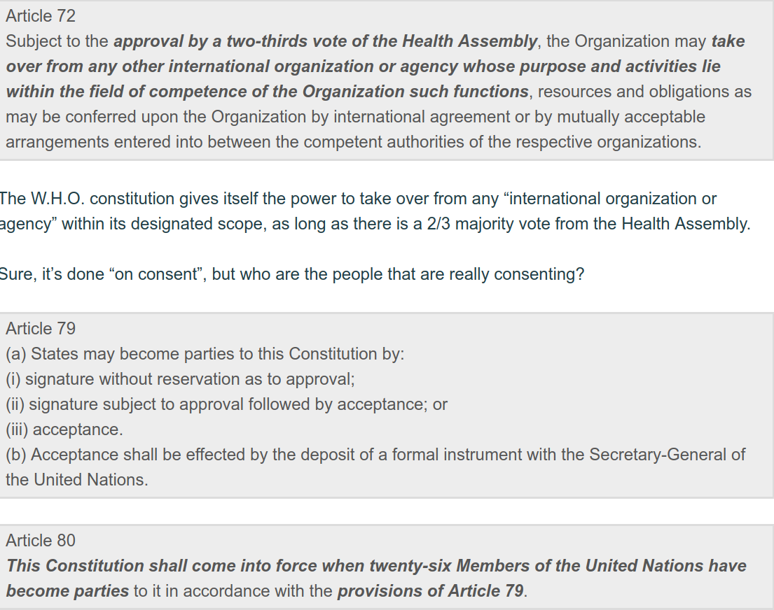 This isn’t everything, but just more eye-opening parts. The full text of the W.H.O. constitution is freely available. Look it up, read it, and see what exactly we have been signed onto without any sort of democratic mandate.