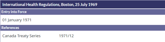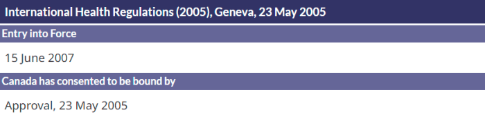 As has been outlined here before, the 2005 Quarantine Act, Bill C-12, was really just domestic implementation of the 3rd Edition of the International Health Regulations.