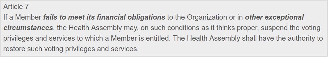 So, being part of this group is voluntary. However, if you don’t pay your bills, WHO can suspend your voting rights. They can also be removed under the undefined “exceptional circumstances”. Sounds a bit undemocratic, doesn’t it?