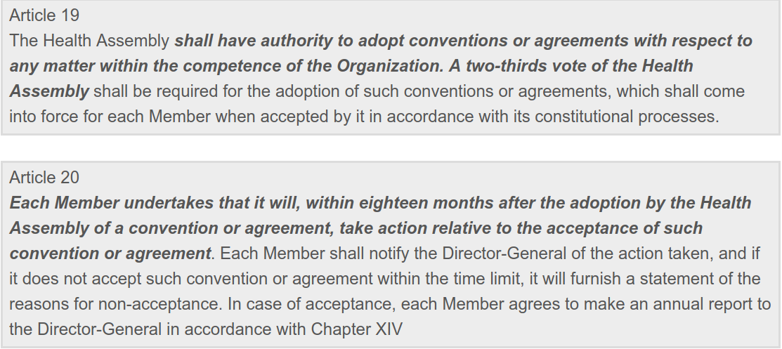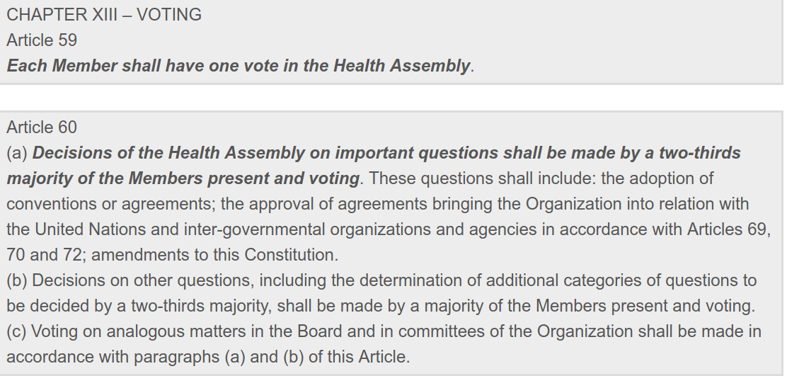 The Health Assembly has the right to determine its own conventions and agreement, and it can be done with a 2/3 vote. By this rationale, Canada could easily be forced into adopting policies that it fundamentally disagrees with. And to state the obvious, there was never any domestic vote or referendum over this.